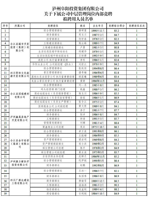 根據(jù)《瀘州阜陽投資集團有限公司關(guān)于下屬公司中層管理崗位內(nèi)部競聘工作的公告》(瀘阜投發(fā)〔2020〕21號)的規(guī)定,經(jīng)阜陽集團黨委會研究決定,擬聘用唐琿蔓等39人為瀘州阜陽投資集團有限公司下屬公司中層管理人員?,F(xiàn)面向社會公示7日,公示時間2020年6月19日至2020年6月25日。公示期間,如有問題,請及時向瀘州阜陽投資集團有限公司組織與人力資源管理部反映。要求舉報者署實名,實事求是地反映問題,并提供必要的調(diào)查線索。