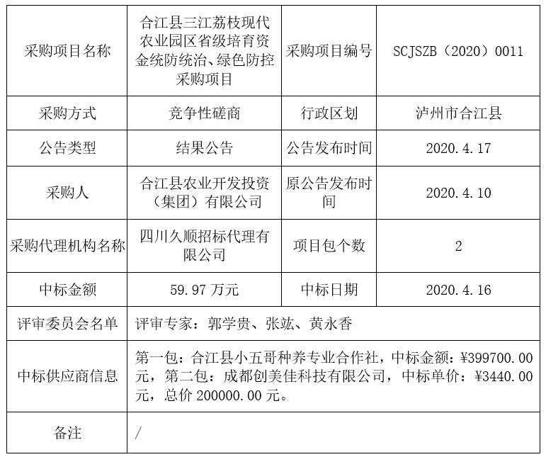 合江縣三江荔枝現(xiàn)代農(nóng)業(yè)園區(qū)省級培育資金統(tǒng)防統(tǒng)治、綠色防控采購項(xiàng)目競爭性磋商結(jié)果公告