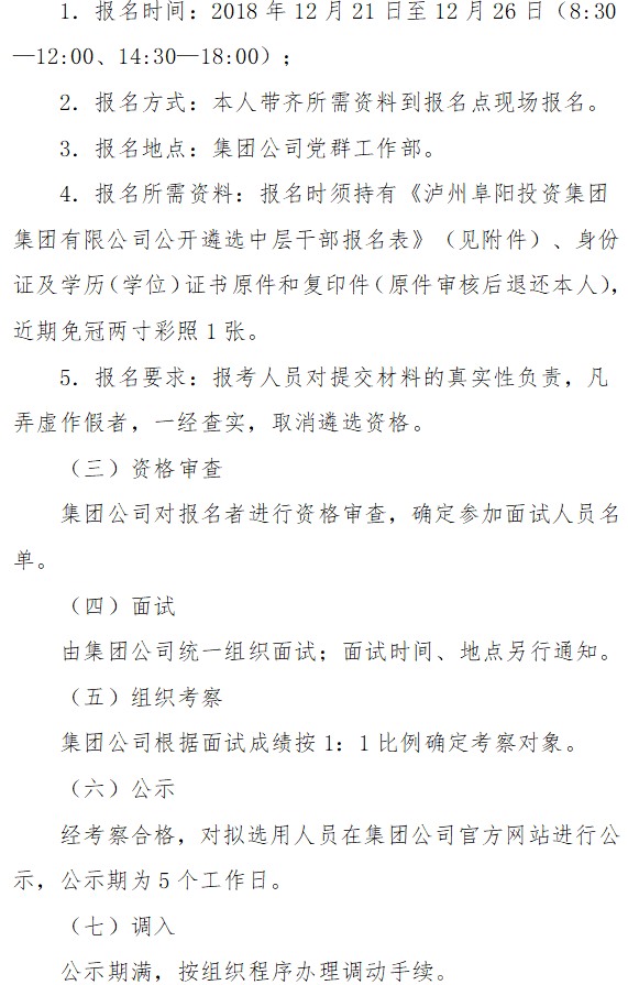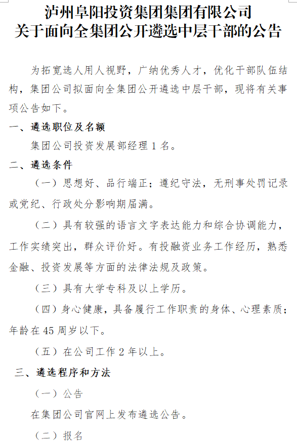 瀘州阜陽投資集團集團有限公司關于面向全集團公開遴選中層干部的公告