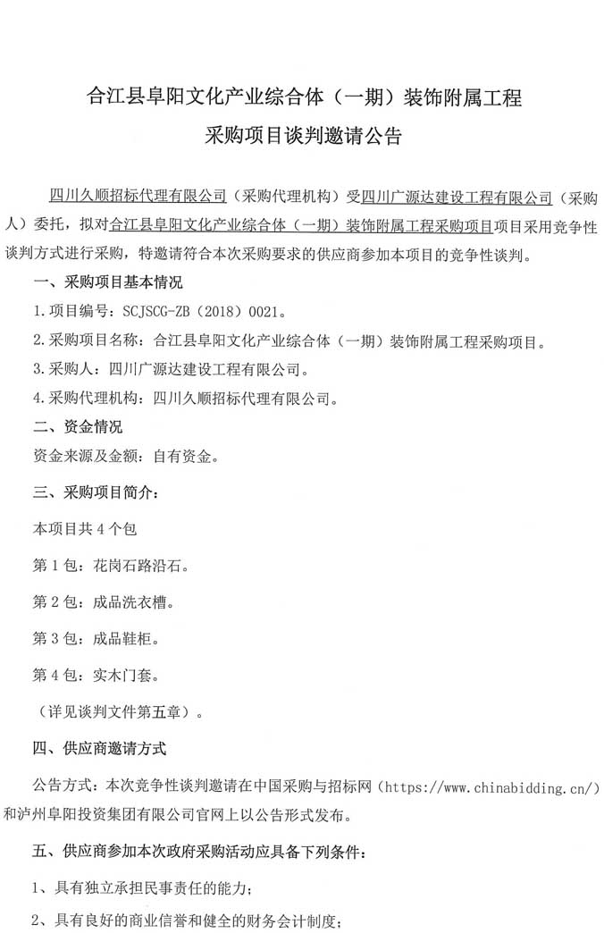 合江縣阜陽文化產(chǎn)業(yè)綜合體(一期)裝飾附屬工程采購項(xiàng)目談判邀請公告.doc
