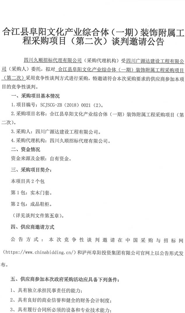 合江縣阜陽文化產(chǎn)業(yè)綜合體(一期)裝飾附屬工程采購(gòu)項(xiàng)目(第二次)談判邀請(qǐng)公告.docx