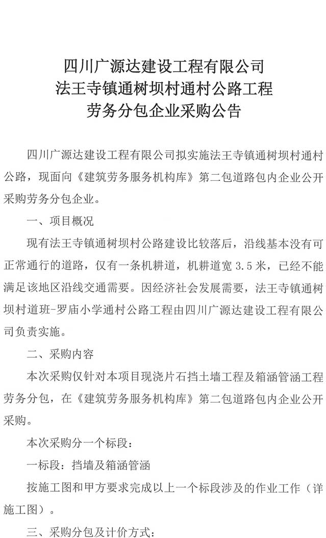 四川廣源達(dá)建設(shè)工程有限公司法王寺鎮(zhèn)通樹壩村通村公路工程勞務(wù)分包企業(yè)采購公告.doc