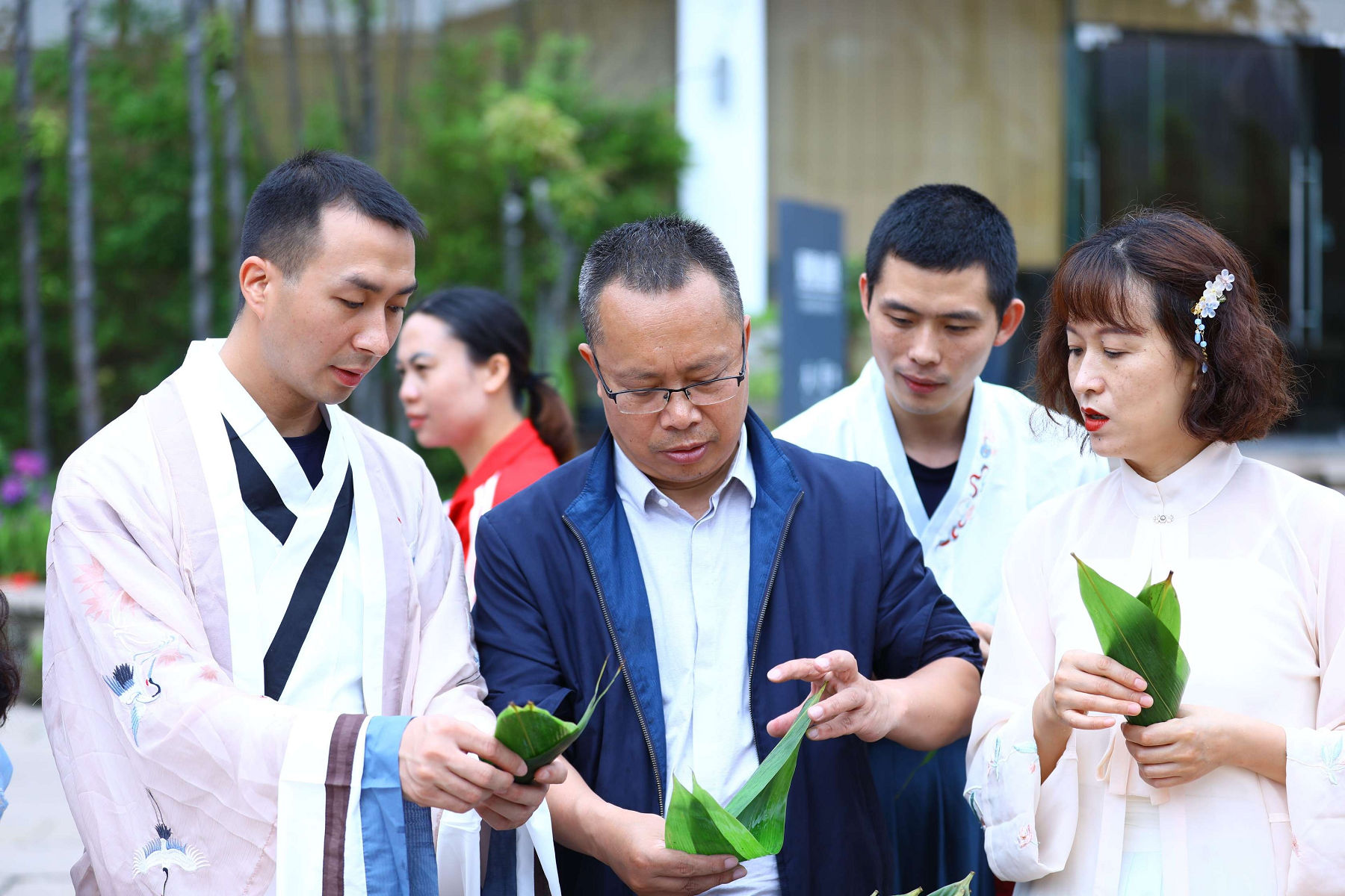 龍掛山景區(qū)是阜陽集團(tuán)下屬符陽文旅公司打造的的文 化休閑度假旅游目的地, 景區(qū)云霧如海, 美景如畫, 建筑獨 具傳統(tǒng)川南民宿特色。 活動中, 阜陽集團(tuán)員工身著漢服, 人 與自然情景交融、交相輝映,仿若穿越到了“狗吠深巷中、 雞鳴桑樹顛”的古代美好田園生活。在見禧 . 山語的院子里, 大家圍成一圈, 開展包粽子比賽。 員工們踴躍參加、 興致高 漲, 集團(tuán)總經(jīng)理任東財和員工們一起動手, 互相學(xué)習(xí)、 邊學(xué) 邊包、 比拼手藝, 包出了三角形、 長方形、 圓錐形等形態(tài)各 異的粽子,現(xiàn)場洋溢著歡樂的節(jié)日氣氛。