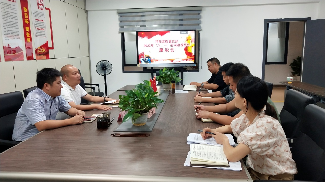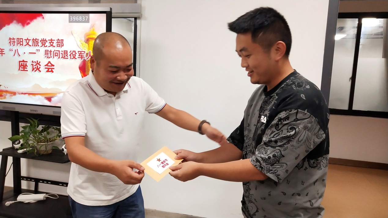 為扎實(shí)做好擁軍優(yōu)屬 、 擁政愛(ài)民工作 , 在 “ 八 一 ” 建軍節(jié)來(lái)臨之際, 符陽(yáng)文旅黨支部開展 “ 八一 ” 慰問(wèn)活動(dòng), 組織文旅 公司工作的退役軍人召開座談會(huì), 了解他們的工作和生活情 況, 為他們送上慰問(wèn)金, 并致以節(jié)日的祝福。 退役軍人表示 感受到公司的關(guān)懷和愛(ài)心,在今后的工作中發(fā)揮軍人本色, 為公司發(fā)展貢獻(xiàn)力量。