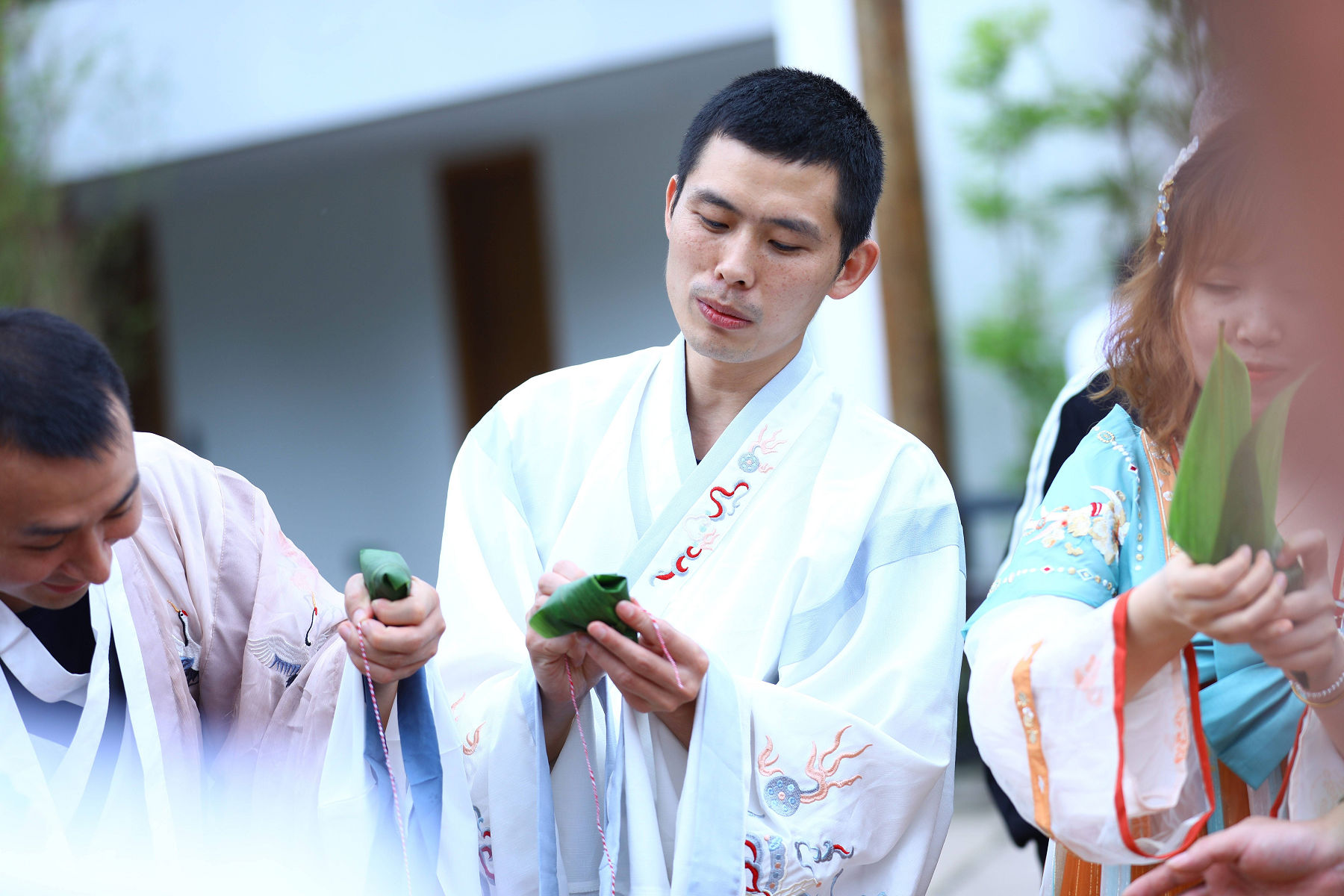 龍掛山景區(qū)是阜陽(yáng)集團(tuán)下屬符陽(yáng)文旅公司打造的的文 化休閑度假旅游目的地, 景區(qū)云霧如海, 美景如畫, 建筑獨(dú) 具傳統(tǒng)川南民宿特色。 活動(dòng)中, 阜陽(yáng)集團(tuán)員工身著漢服, 人 與自然情景交融、交相輝映,仿若穿越到了“狗吠深巷中、 雞鳴桑樹顛”的古代美好田園生活。在見禧 . 山語(yǔ)的院子里, 大家圍成一圈, 開展包粽子比賽。 員工們踴躍參加、 興致高 漲, 集團(tuán)總經(jīng)理任東財(cái)和員工們一起動(dòng)手, 互相學(xué)習(xí)、 邊學(xué) 邊包、 比拼手藝, 包出了三角形、 長(zhǎng)方形、 圓錐形等形態(tài)各 異的粽子,現(xiàn)場(chǎng)洋溢著歡樂的節(jié)日氣氛。